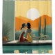 El ilustracion vintage representa a dos mujeres elegantes vestidas con estilo que comparten un beso tierno junto a una piscina tranquila. La escena se encuentra frente a una pintoresca puesta de sol, con tonos cálidos reflejando el agua.