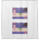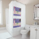 Esta cortina blanca de ducha está diseñada con mi representación de una escena náutica azul, que incluye un faro, una playa y veleros.