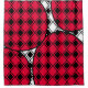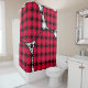 Esta cortina de ducha tiene un diseño moderno de mediados de siglo de diamantes negros sólidos dentro de los contornos de diamante negro con manchas rosas debajo de ellos, todo en un campo de blanco.