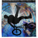 La acción de los deportes y la energía de los atletas de BMX que realizan trucos y trucos del extremo en sus bicis. Esta imagen muestra a un jinete que realiza un salto del truco en el medio de un túnel azul del grunge con la punta de la luz