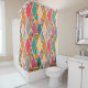 Esta cortina de ducha tiene un diseño boho de diamantes con diferentes patrones alternando con diamantes sólidos en una paleta de colores boho.
