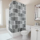 Esta cortina de ducha tiene un diseño boho de cuadrados con motivos en blanco y negro.