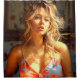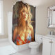 Esta cortina de ducha tiene una dama de bonito retratada.