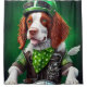 Un amigo peludo detrás de las manillares de una brillante bicicleta verde, usando un traje verde del Día del San Patricio que hace que las cabezas se vuelvan. El perro está vestido con un conjunto festivo, con una corbata verde de arco y un sombrero superior a juego que se sienta cómodos sobre su cabeza. El conjunto presenta un diseño intrincado de rocas de champú y leprechauns, lo que deja claro que este perro está listo para celebrar el Día de San Patricio con estilo.