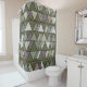 Esta cortina de ducha tiene un diseño moderno de mediados de siglo de triángulos superpuestos que se desplazan horizontalmente en colores de camo.