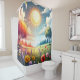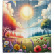 Un campo de ensueño, césped con flores silvestres, árboles, nubes onduladas, el sol y la luna.