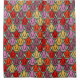 Esta cortina de ducha tiene un diseño art deco de tulipanes de pentagones y trapezoides en naranja, rojo, púrpura, dorado y verde.