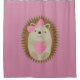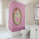 Un chica personalizado lindo abrazando una cortina de ducha de corazón rosa.