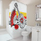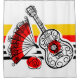 Diseño caprichoso de estilo retro con recuerdos de una fiesta española; guitarra de hierro forjado, ventilador de encaje y rosa roja sobre fondo a rayas. Un diseño de personalizable en blanco, negro, rojo y amarillo dorado para que puedas personalizar con tu propio texto, imágenes e ideas. Imagen original de arte digital.