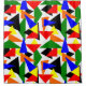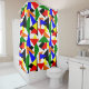 Esta cortina de ducha tiene un diseño Bauhaus de un collage de triángulos en rojo, amarillo, naranja, azul y verde.