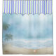 Cortina de ducha de tela tropical con dibujos de una bonita playa de arena con palmeras y agua azul. Una valla de rayas azules, verdes y blancas, en la parte superior, da la impresión de una cabaña con estilo de tienda.