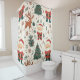 A charming Christmas pattern shower curtain featuring adorable teddy bears dressed as Santa, festive gift boxes, decorated Christmas trees, candy canes, ornaments, and snowflakes on a white background. This cozy holiday design blends warm, hand-drawn illustrations with a playful winter feel.