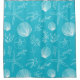 La cortina de la ducha es una repetición de las conchas blancas de mar, las estrellas de mar, los dólares de arena y las algas sobre un fondo azul turquesa. El acento es perfecto para un descanso junto al mar.