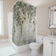 Esta bonita cortina de ducha biofílica de colores suaves tiene hiedra sobre un fondo neutro.