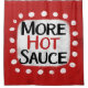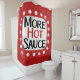 "Más Salsa Caliente" es un lindo diseño de texto en rojo con texto en negro y rojo, junto con una forma de acento blanco y puntos caprichosos de textura blanca que lo rodean.