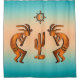Decore su cuarto de baño con esta única cortina de ducha de cobre del suroeste de Kokopelli. Dos Kokopelli de cobre juegan a la flauta y bailan alrededor de un cactus bajo el sol sobre fondo turquesa y Naranja de la puesta de sol. Este es un Diseño de Arte Original del artista Kerry Miller.