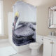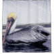 Perfil de un pelícano - el pelícano marrón en la foto en esta cortina de ducha se está deslizando a lo largo del agua de un canal en la Costa del Golfo de la Florida. El lado de un barco en el fondo muestra las reflexiones brillantes del agua azul. La foto está en sombras de los azules, grises suaves y marrones, con un tacto del amarillo en la cabeza del pelícano.