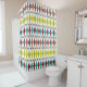 Esta cortina de ducha tiene un diseño moderno de mediados de siglo de diamantes estirados y estribos en un campo blanco.
