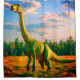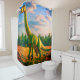 Esta cortina de ducha tiene un dinosaurio retratado.