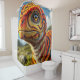 Esta cortina de ducha tiene un dinosaurio.