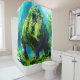 Esta cortina de ducha tiene un gran dinosaurio verde.