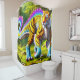 Esta cortina de ducha tiene un dinosaurio tigre encima.