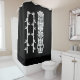 Cortina de ducha tropical Tiki. Los cuartos de baño son modernos, con un toque tropical, y están decorados en tonos blancos y negros divertidos.