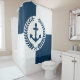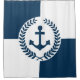 Diseño de temática náutica con decoración de coronas de ancla y laurel sobre fondo geométrico azul y blanco