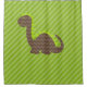 Cortina de ducha con un dragón de rayas de chevron marrón sobre un fondo de rayas diagonales verdes.