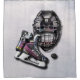 Duende malicioso del casco de los patines del hockey sobre hielo con el dibujo del nombre y del número en colores púrpuras, grises, del oro, azules y negros en fondo del hielo. Usted puede personalizarlo con su nombre y número