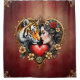 El corazón del desierto oculto, un tigre majestuoso y el perfil de una mujer están artísticamente mezclados. Ambos motivos están empotrados en un marco elegante en forma de corazón que resalta el ambiente romántico. El marco está ricamente decorado con delicados motivos florales que envuelven armoniosamente a su alrededor, dándole un toque divertido e imaginativo. Entre las flores hay un corazón rojo brillante, que simboliza el amor y la pasión.