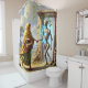 Esta fantástica cortina de ducha tiene una mujer del pasado encontrando un robot del futuro retratado en ella.