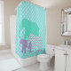 Cortina de ducha con tres elefantes en color violeta, turquesa y blanco con rayas de chevron y puntos de polka sobre un fondo de polka azul acuático.