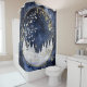 Escena de invierno con delicados acentos dorados rodeando un bosque nevado, sobre un fondo celestial azul profundo. La combinación de copos de nieve brillantes y pinceladas artísticas crea un diseño sereno inspirado en las vacaciones.