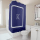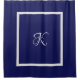Elegante monograma inicial azul Cortina de ducha. Hermoso patrón inmaculado de tela de jouy Azul sobre fondo blanco.Las impresiones de tela son una rabia de todos los tiempos en este momento, esta es una elegante y ornamentada tela vintage de jouy con un patrón de damasco exótico, un estilo divertido que actualmente es tendencia para la decoración del hogar, ropa, estuches para móviles e Ipad, invitaciones y mucho más. El diseño es clásico y atemporal, con un impresionante color. Puede cambiar todos los colores y tipos de letra del texto, haga clic en el personalizar situado más abajo del área de personalización del texto que le llevará a la herramienta de diseño. Un regalo único para el cumpleaños, las vacaciones y cualquier ocasión especial. Ya sea para día de San Valentín, Navidades o como regalo en general, hace una gran idea de regalo