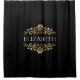 Una elegante cortina de ducha en monograma en color negro y dorado. Añade tu nombre entre el florecimiento floral de oro en la parte delantera. Diseñado para ti por Blackberry Boulevard.
