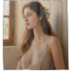 A dreamy portrait of a woman with captivating green eyes and flowing wavy hair, gazing thoughtfully out of a window bathed in soft natural light. This image embodies serene beauty and ethereal charm, perfect for art prints, home decor, and a variety of personalized products.