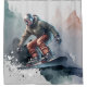 Una pieza de medios mixtos con un esquiador de nieve detallado y una escena de montaña en acuarela.