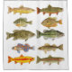 Variedad de pescados, incluyendo lubina y trucha de las acuarelas originales de Thom Glace sobre una cortina de ducha.