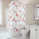 Cortina de ducha divertida con flamencos tropicales de bonito sobre un fondo blanco. ¡Perfecto para tu casa de playa de verano!