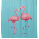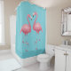 La cortina de ducha se muestra en un color sólido de agua profunda con una bonita huella tropical de flamencos. Busque el Personalizar de la alfombra de baño correspondiente en este artículo o compre tal como está.