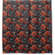 Flores y bayas rojas con hojas grises sobre un fondo negro.