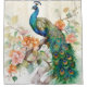 Cortina de ducha con un cuadro de un elegante pavo real azul y verde en las ramas de un árbol lleno de flores rosadas y de color naranja/melocotón.
