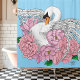 Un cisne blanco rodeado de flores rosas en un fondo azul