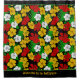 Cortina de ducha negra con motivos de flores rojas y amarillas tropicales de Hibiscus y hojas de palma verdes. En la parte inferior está la cita "Bienvenido a mi baño", que es personalizable para que puedas añadir tu propio texto, o borrar si lo prefieres