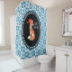 Cortina de ducha con un bonito ilustracion naranja zorro dentro de un oval negro. Lleva puesto un sombrero de santa roja y tiene acentos decorativos verdes festivos sobre su cola y sobre su pecho. Feliz Navidad también está escrito dentro del marco oval. El fondo es un patrón con copos de nieve azules y blancos.
