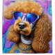 Perro de caniche humorado con un par de llamativas gafas de sol con un diseño único que presenta un caleidoscopio de tonos rosa, azul, púrpura y naranja.