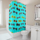 Esta cortina de ducha tiene un diseño moderno de mediados de siglo de gafas de sol retro en un campo azul con una rejilla.