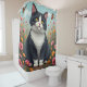 Un gato blanco y negro con ojos brillantes se sienta entre las flores de colores, observando a dos mariposas revolotear cerca. La escena es vibrante y serena, con un hermoso telón de fondo azul.