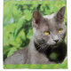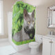 Los amantes de los animales se bañan con una cortina de verde limón y un gatito gris. Decoración moderna y elegante con baño en casa.